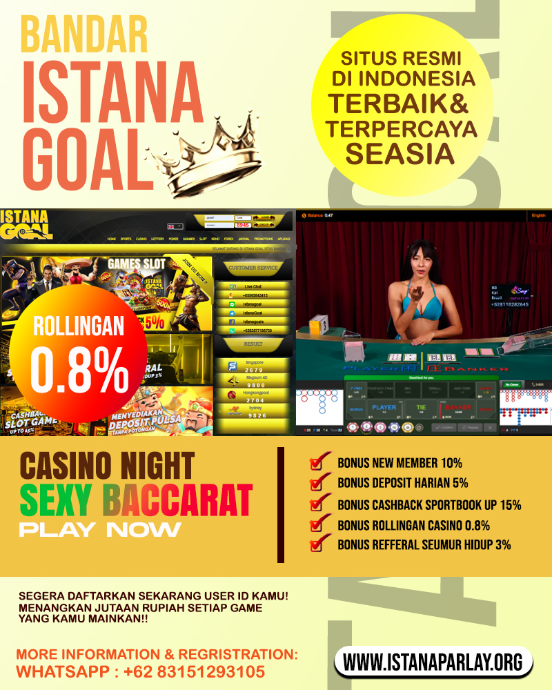 Selamat datang di ISTANA GOAL, bandar judi online terpercaya yang telah dipercaya ribuan pemain dari seluruh Asia. Kami menghadirkan pengalaman bermain terbaik, dengan fitur lengkap, tampilan modern, dan bonus melimpah untuk semua member setia kami!